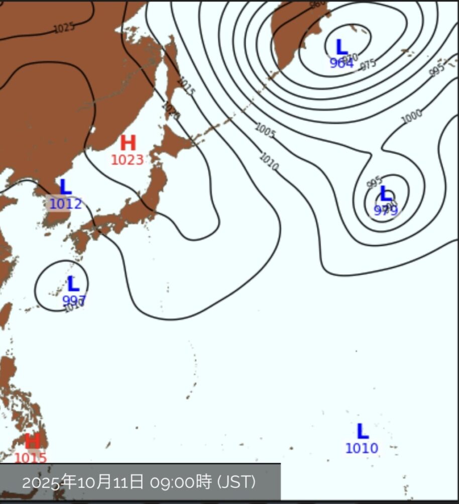 11日(土)は、高気圧に覆われますが、湿った空気の影響で雲が多くなる見込みです。また、台風23号は、奄美大島の南東海上を進みながら北〜北東寄りに進路を変え、北上する見込みです。