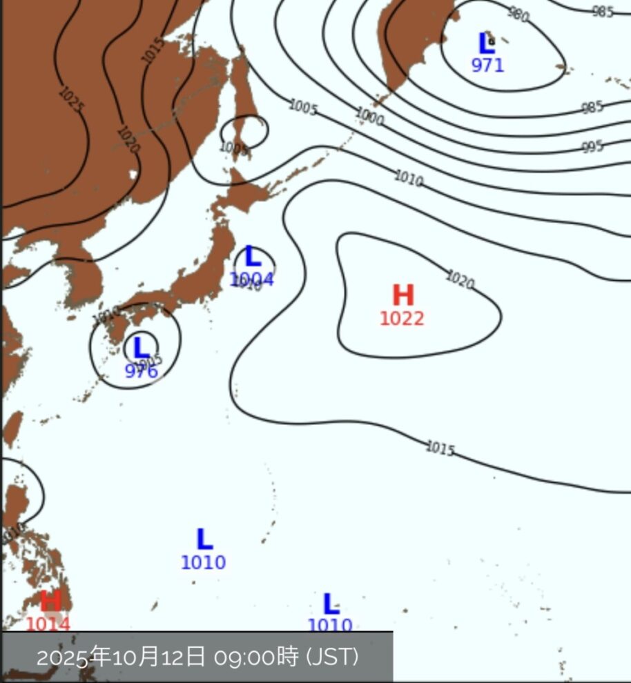 12日(日)は、日本海に停滞していた前線が徐々に南下し、雲が多く、時折雨も降りやすくなる見込みです。また、台風23号は、九州の南海上を北東へ進む見込みです。