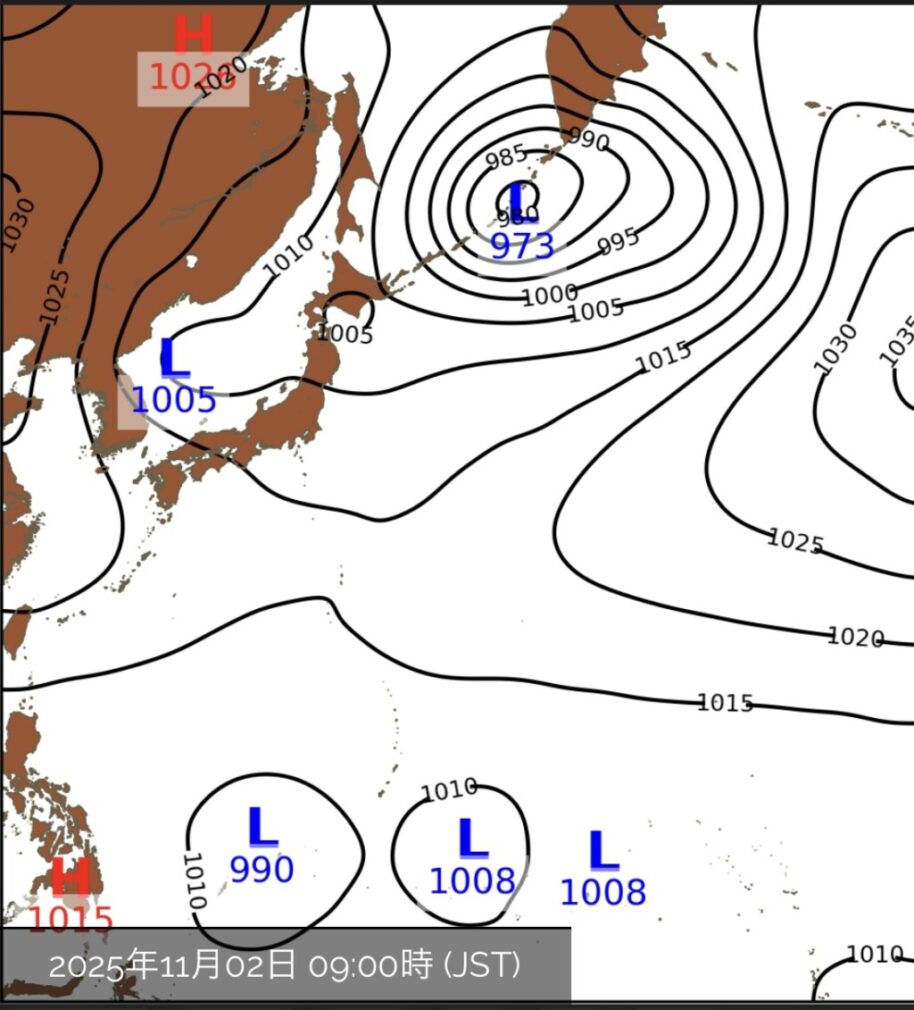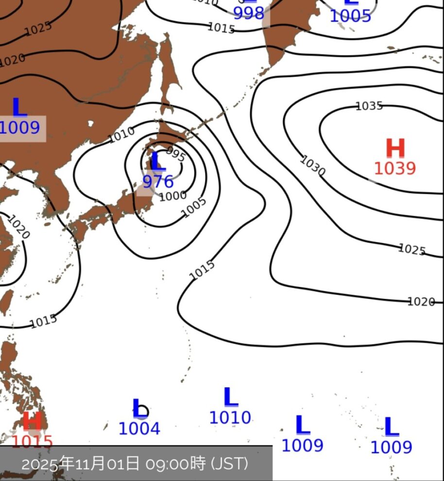 11月1日(土)は、朝のうちに気圧の谷による低気圧が抜けて、上空の寒気が南下し、冬型の気圧配置となりそう。