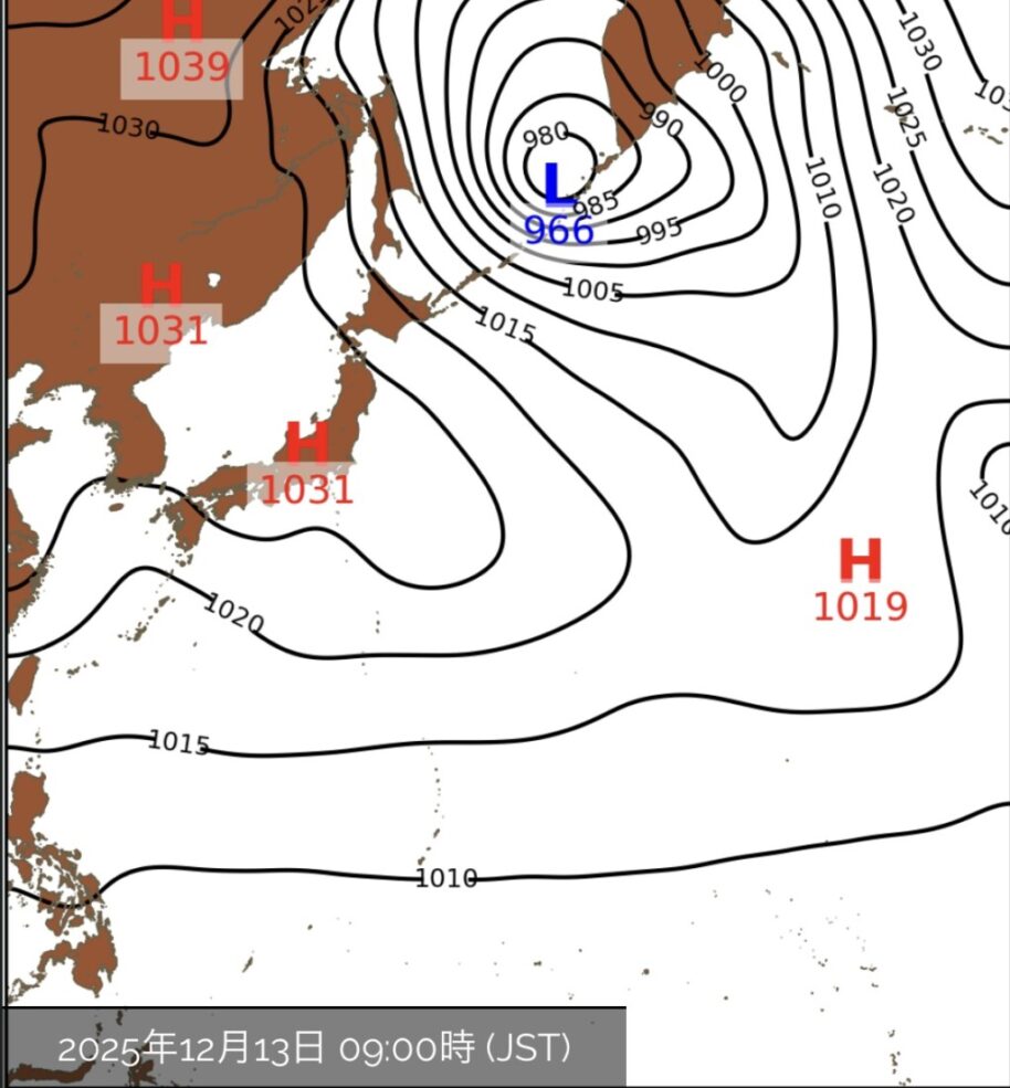 13日(土)は、初め高気圧に覆われて晴れていますが、西から気圧の谷が近づいてくるので、午後は次第に雲が多くなってくるでしょう。