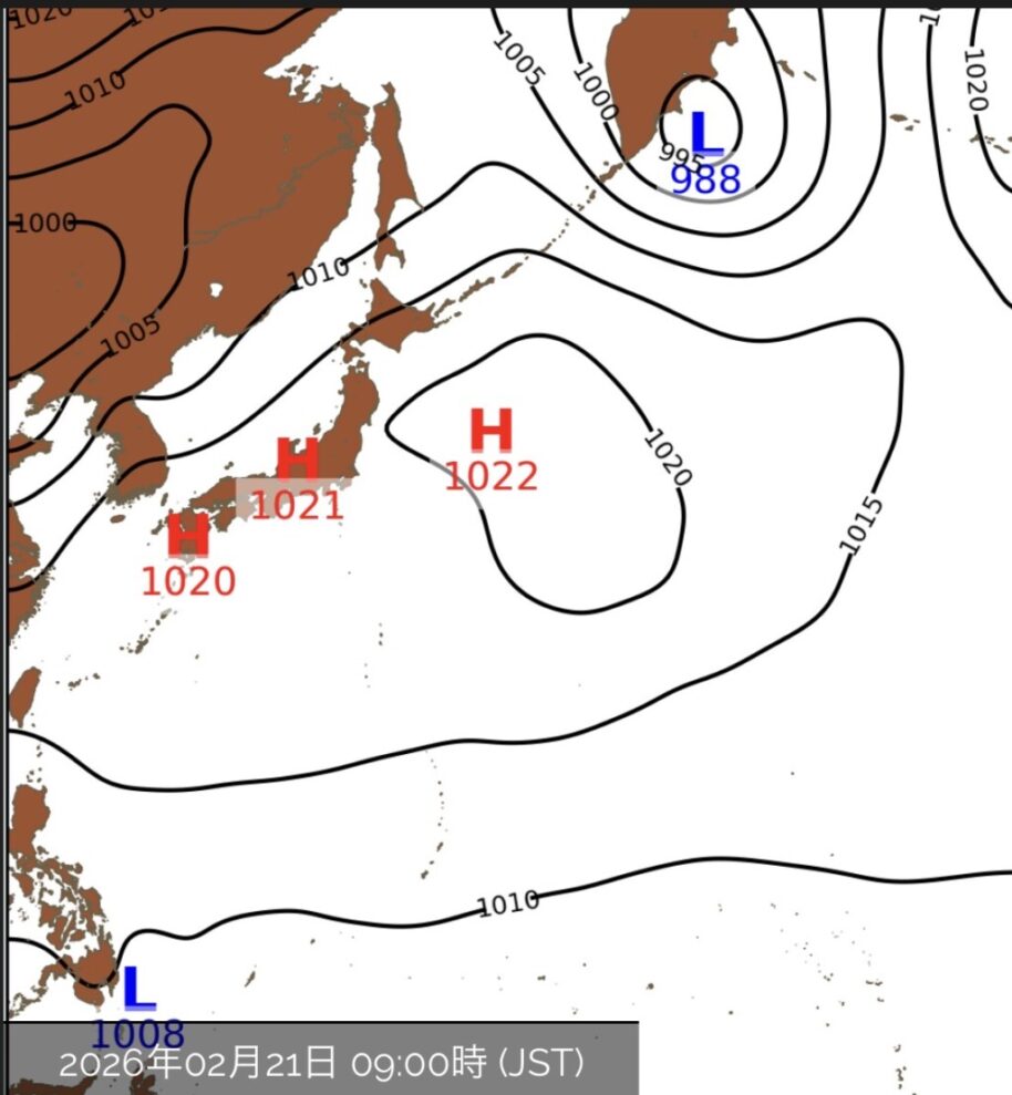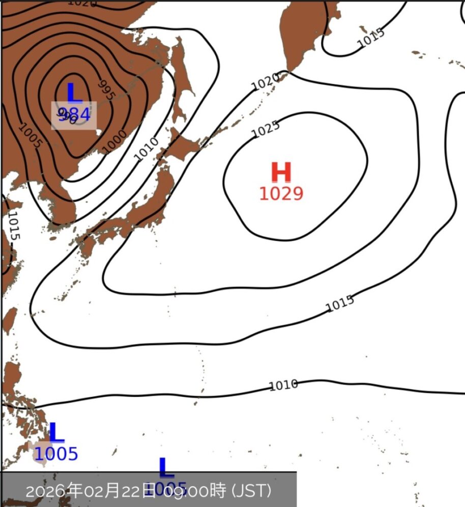 22日(日)は、大陸にある発達中の低気圧から伸びる寒冷前線が徐々に南下し、その影響で雲が多い1日となりそうです。