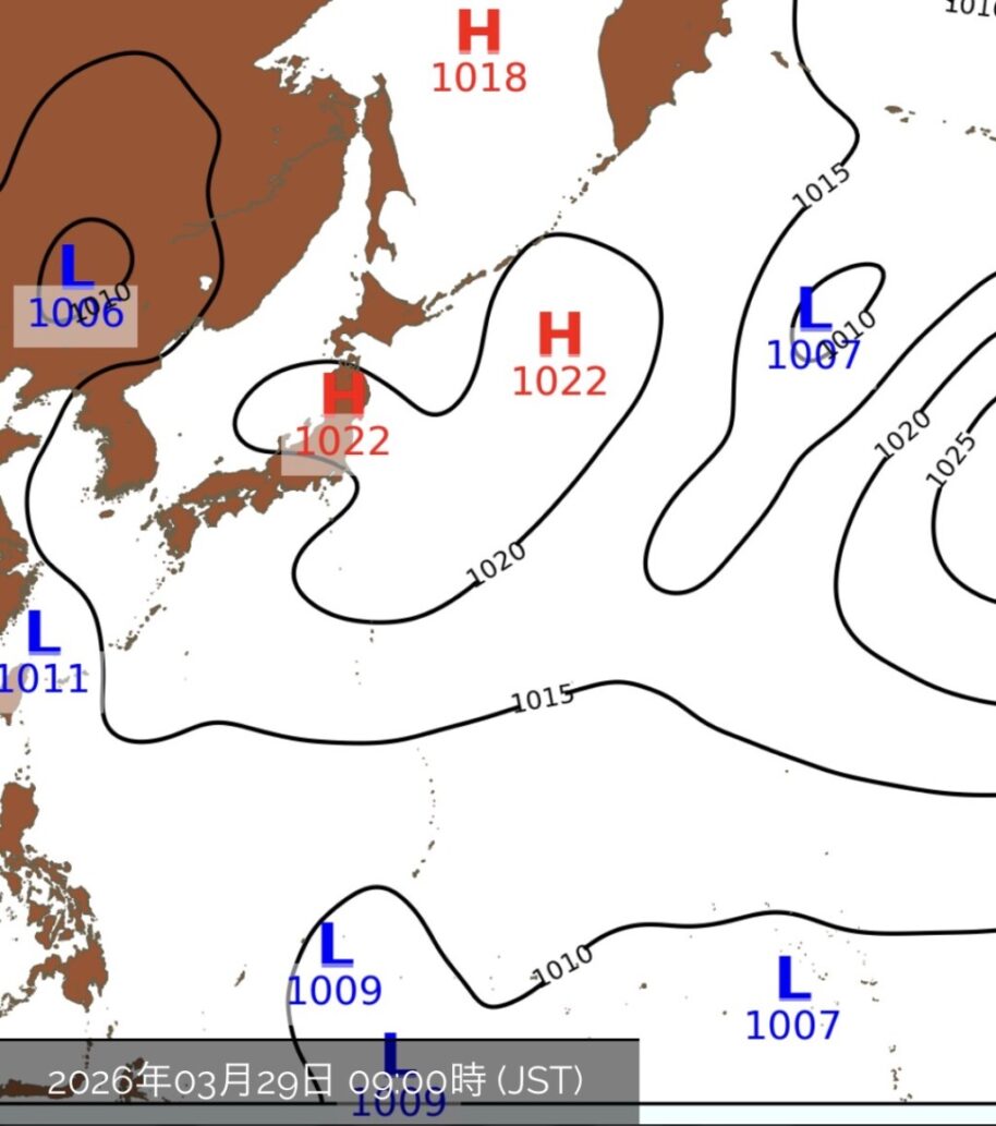 29日(日)も高気圧に覆われ、朝から晴れて良いお天気となりそうですが、夕方以降は、西から近づく気圧の谷の影響で、雲が多くなってくるでしょう。