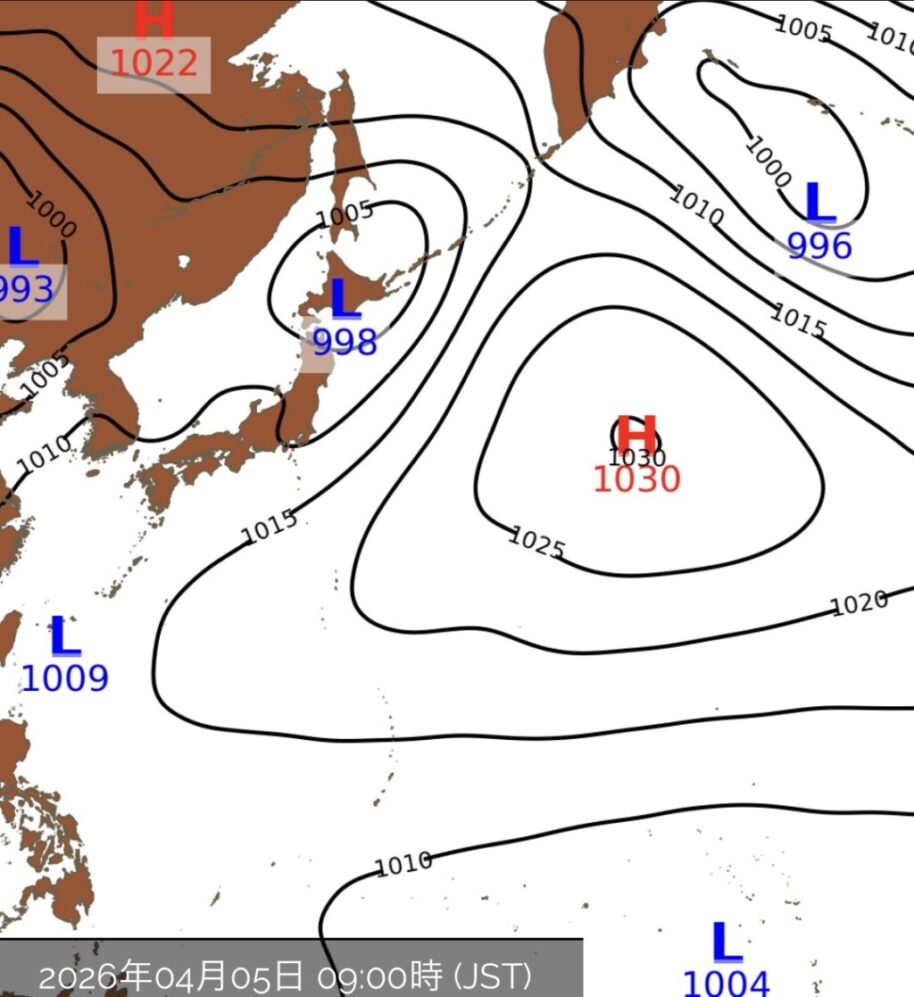5日(日)は、低気圧は北海道からオホーツク海へ抜けていきそうですが、低気圧から伸びる前線が南海上に残り、天気はぐずつき、朝から雲に覆われ、雨も降りやすい見込みです。